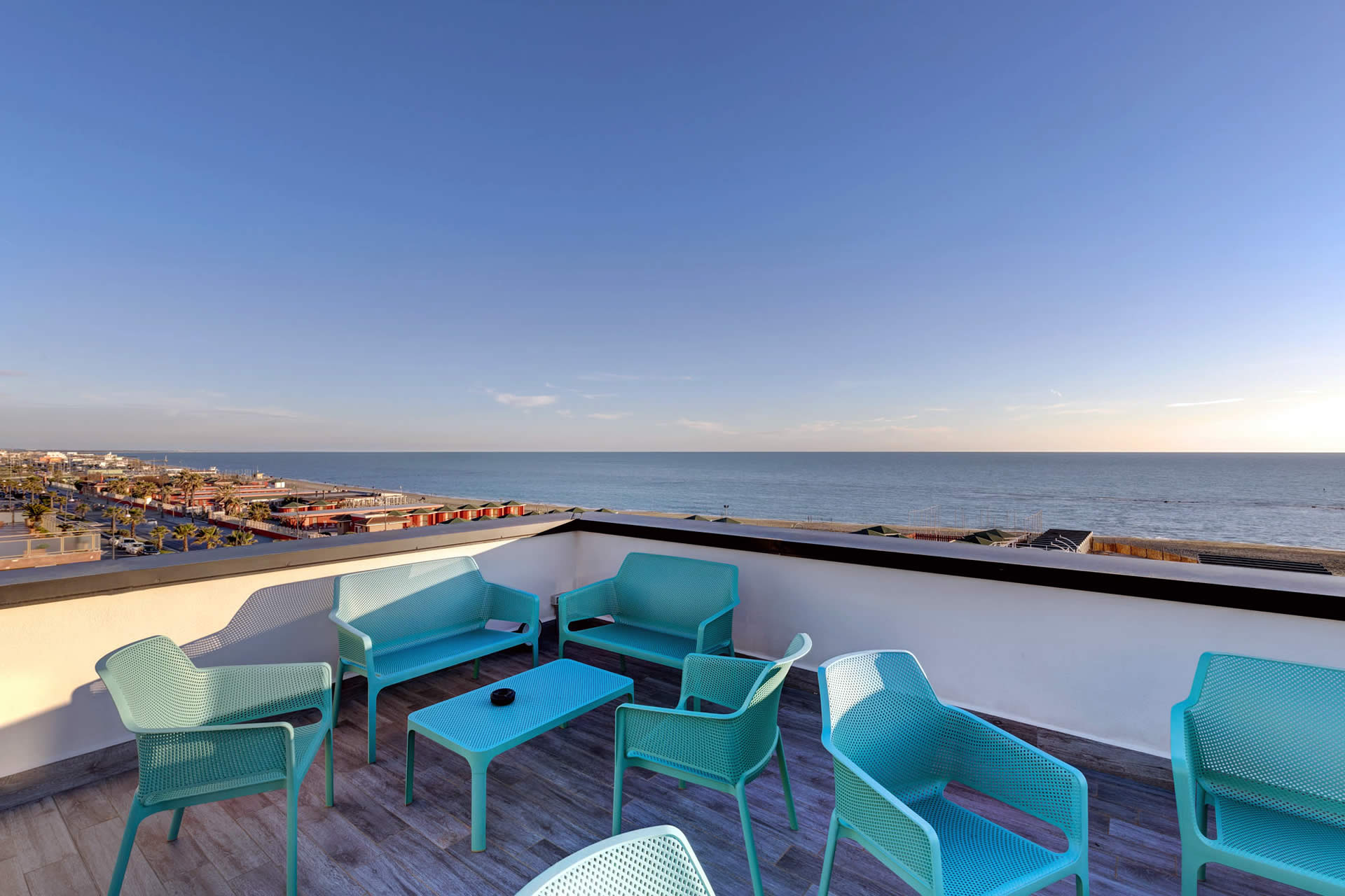 All'ultimo piano del Fly Decó Hotel di Ostia, si apre una terrazza panoramica che regala una vista incantevole sul mare e sulla costa romana.